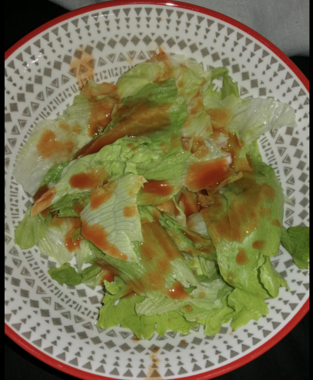Imagine the photo below but with 5x the salad and 5x the hot sauce
